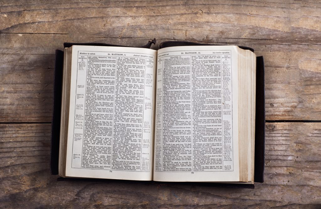 Opened bible on a wooden desk background.